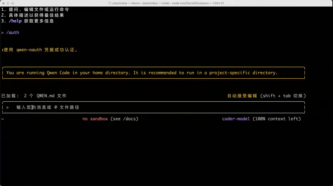 You'll see the Qwen Code welcome screen with your session information, recent conversations, and latest updates. Type `/help` for available commands.